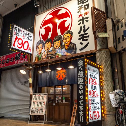 懐かしい昭和30年代の街並「昭和横丁」を抜けると、お店の入り口に到着♪昭和大衆ホルモン京橋北店には美味しい焼肉&ホルモン食べ飲み放題をご用意しております。会社のご宴会に、仲間内のお集まりにもご活用いただけます!がっつりと新鮮ホルモン焼肉でお腹を満たし、冷たいビールで疲れを吹き飛ばしてお楽しみください♪